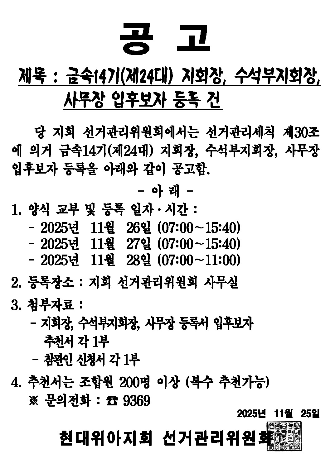 | 1031 | 선관위공고) 지회 임원선거 입후보자 확정 건.. | 2025-11-28 | 15 | |