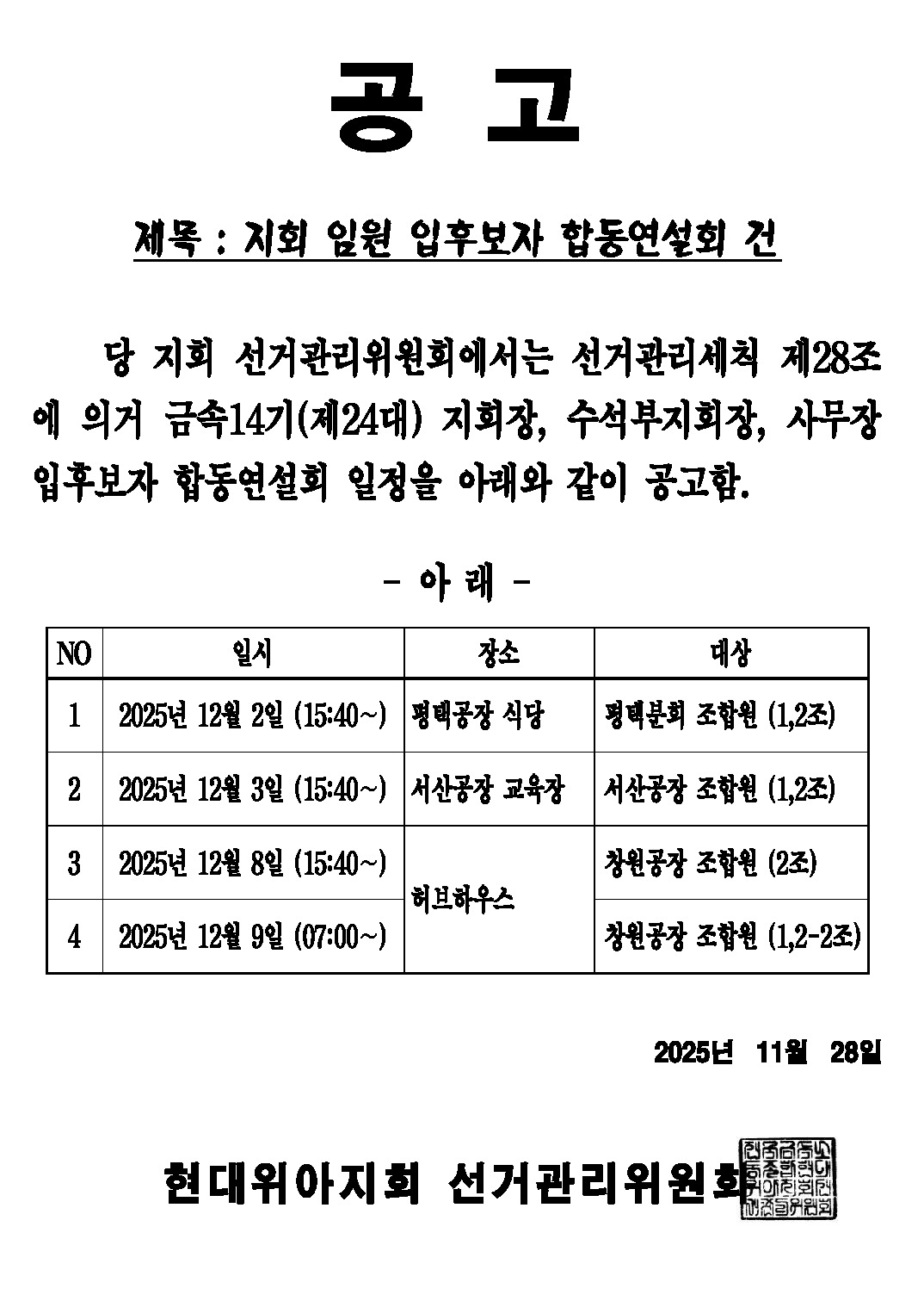 | 1031 | 선관위공고) 지회 임원선거 입후보자 확정 건.. | 2025-11-28 | 16 | |