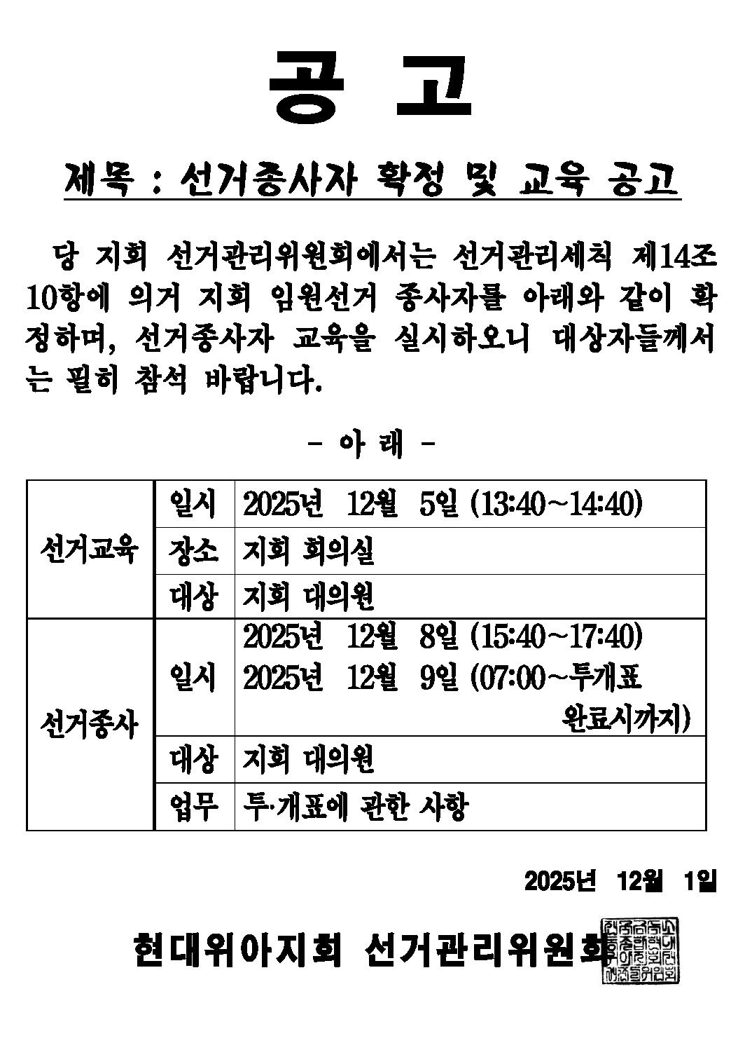 | 1031 | 선관위공고) 지회 임원선거 입후보자 확정 건.. | 2025-11-28 | 15 | |
