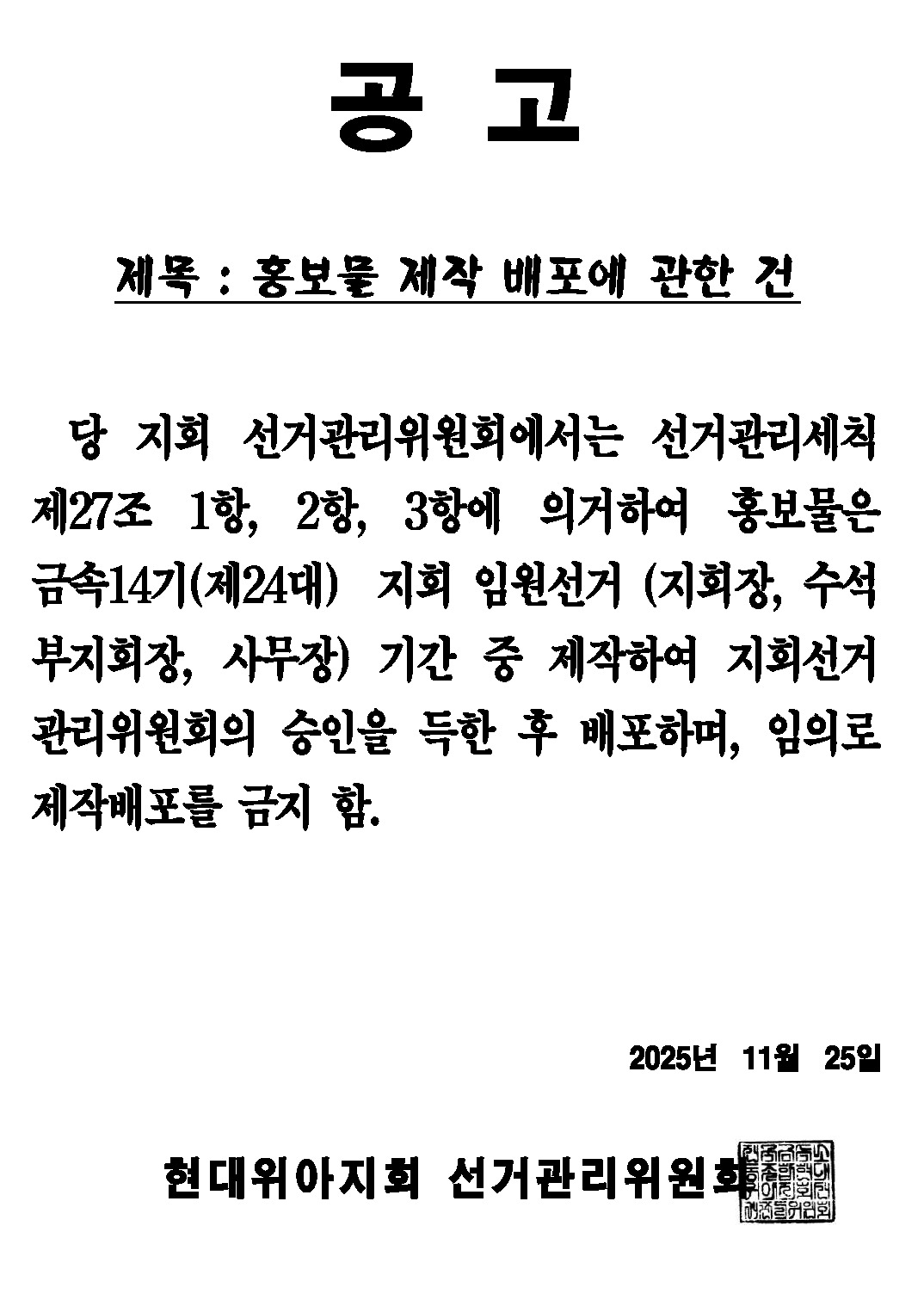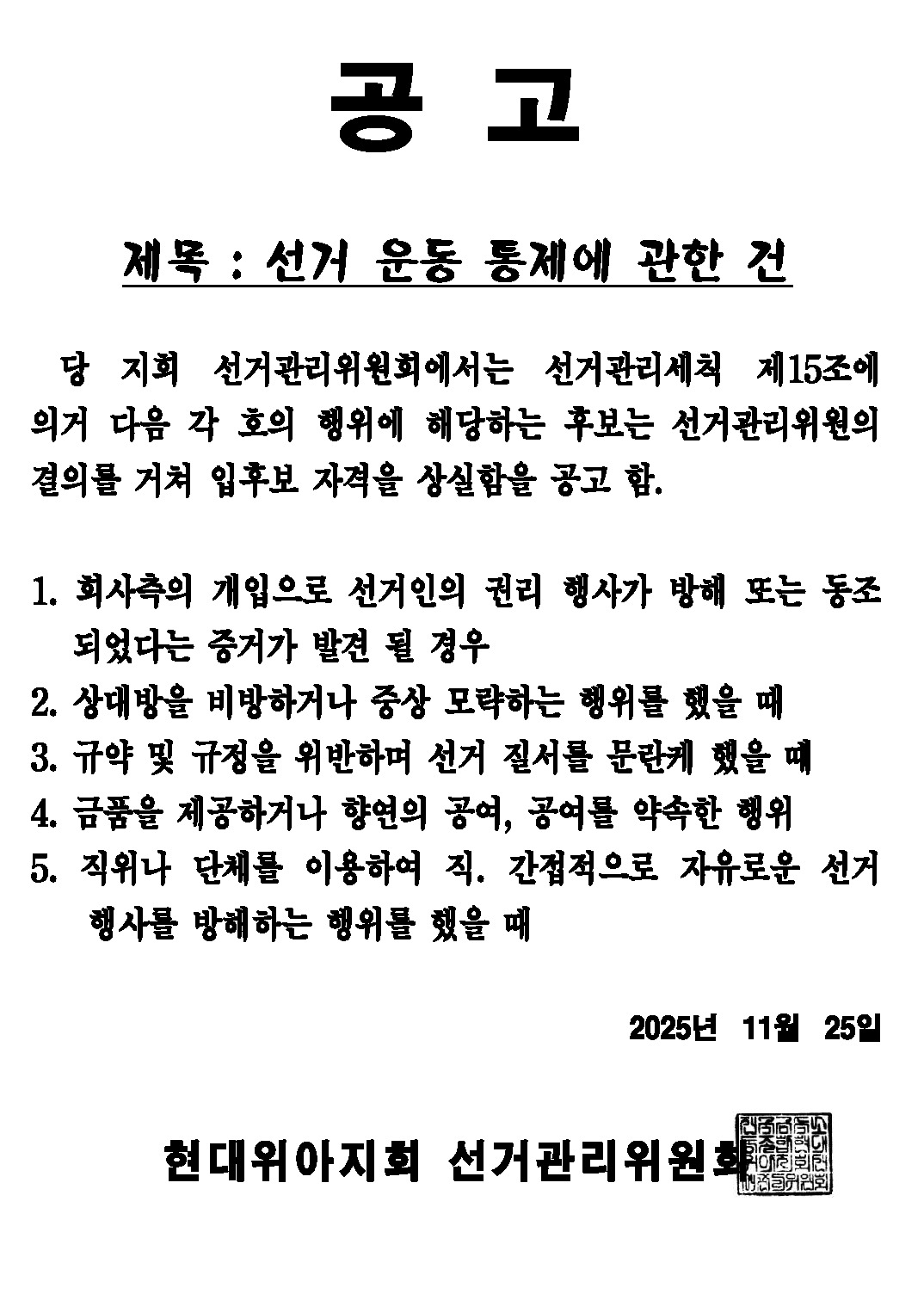 | 1031 | 선관위공고) 지회 임원선거 입후보자 확정 건.. | 2025-11-28 | 21 | |