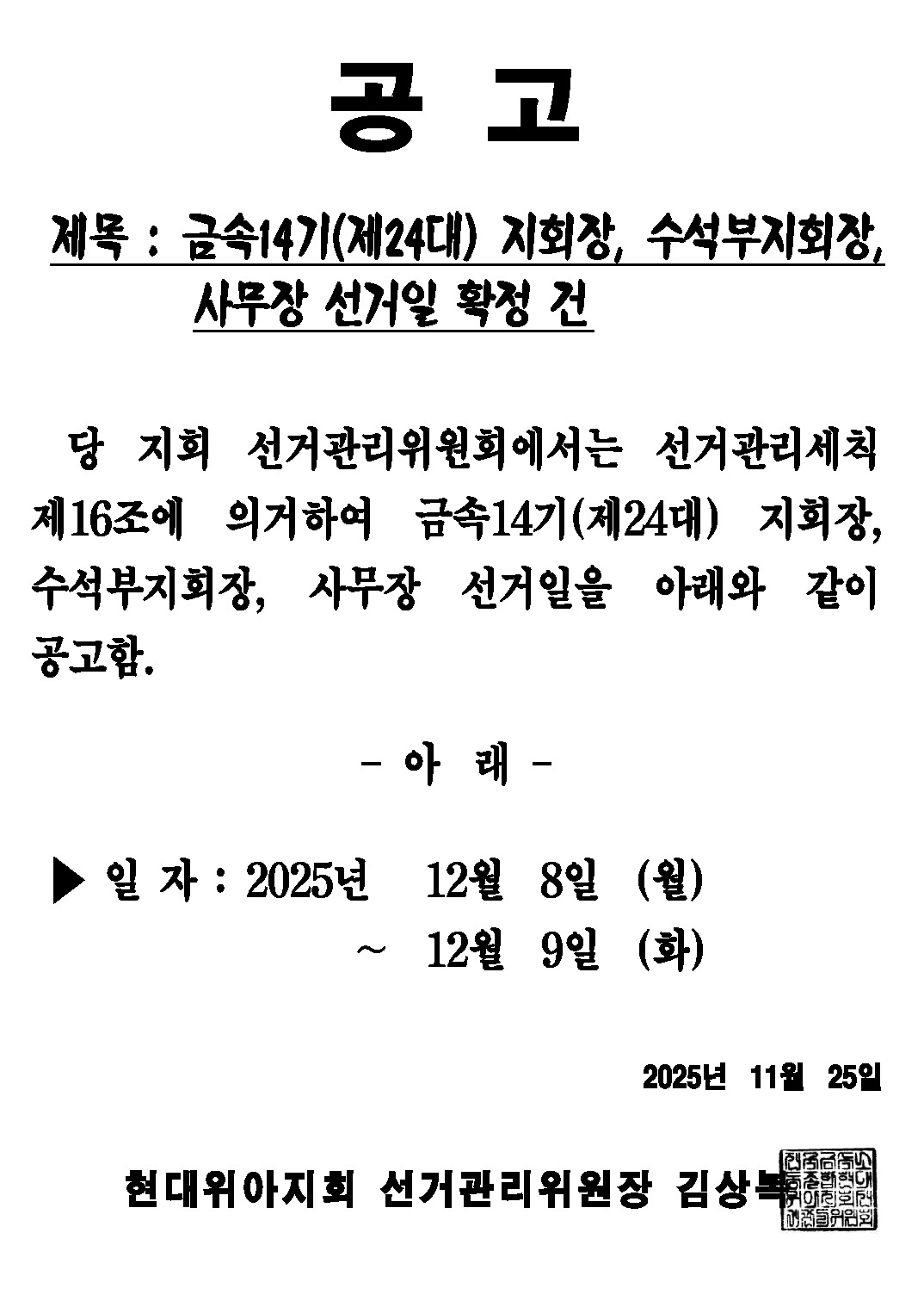 | 1033 | 공고) 조합원 임시총회 건 (금속14기 임원선거.. | 2025-12-02 | 11 | |