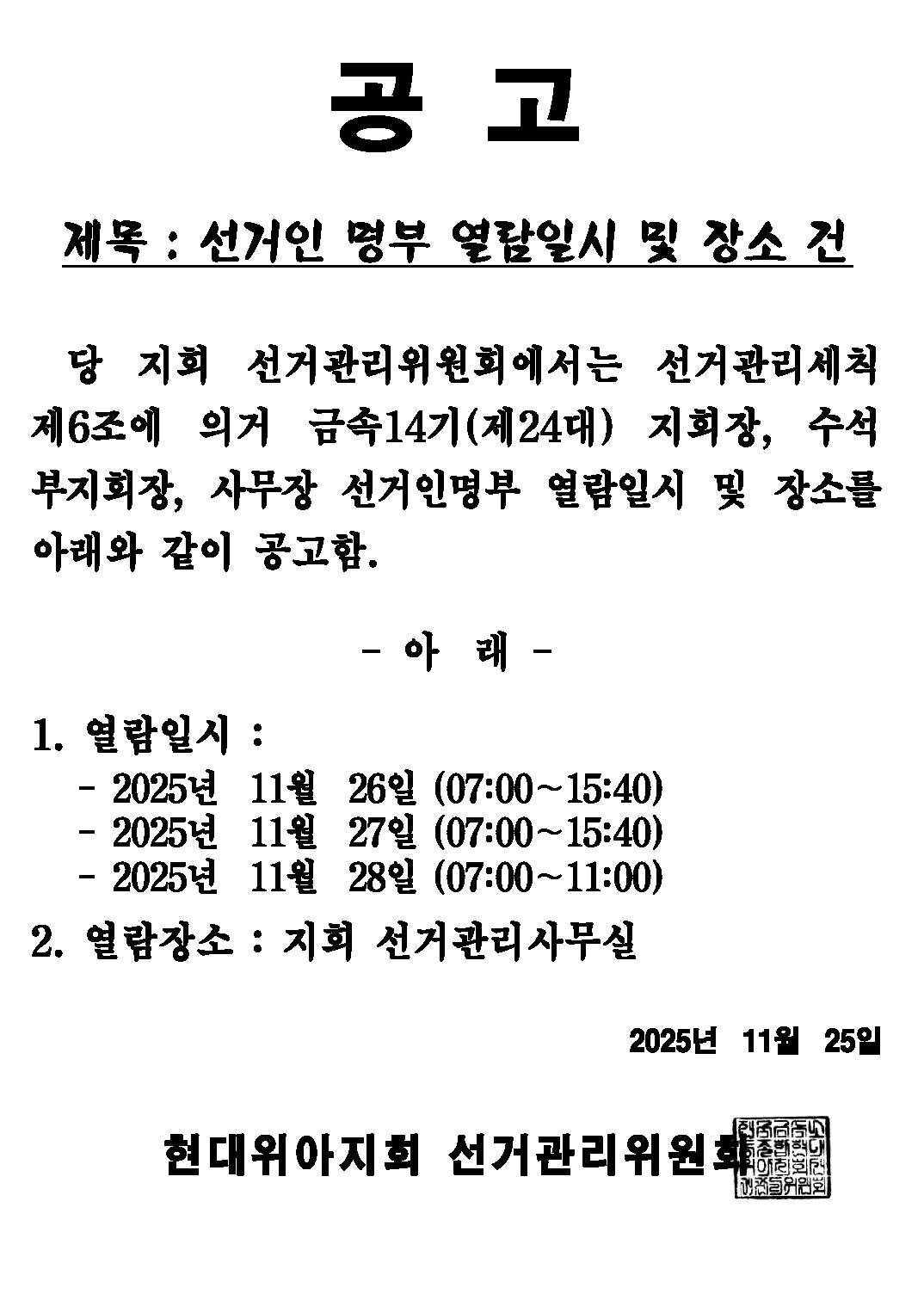 | 1032 | 선관위공고) 지회 임원선거 투표시간,장소,용.. | 2025-12-01 | 12 | |