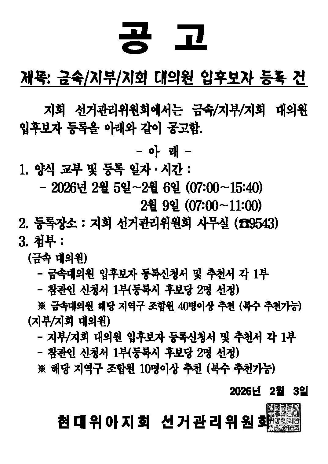 | 제목 | 선관위공고) 26'금속,지부,지회대의원 선거일 확정, 배정표, 입후보 등록 및 명부열람 건 외 | ||