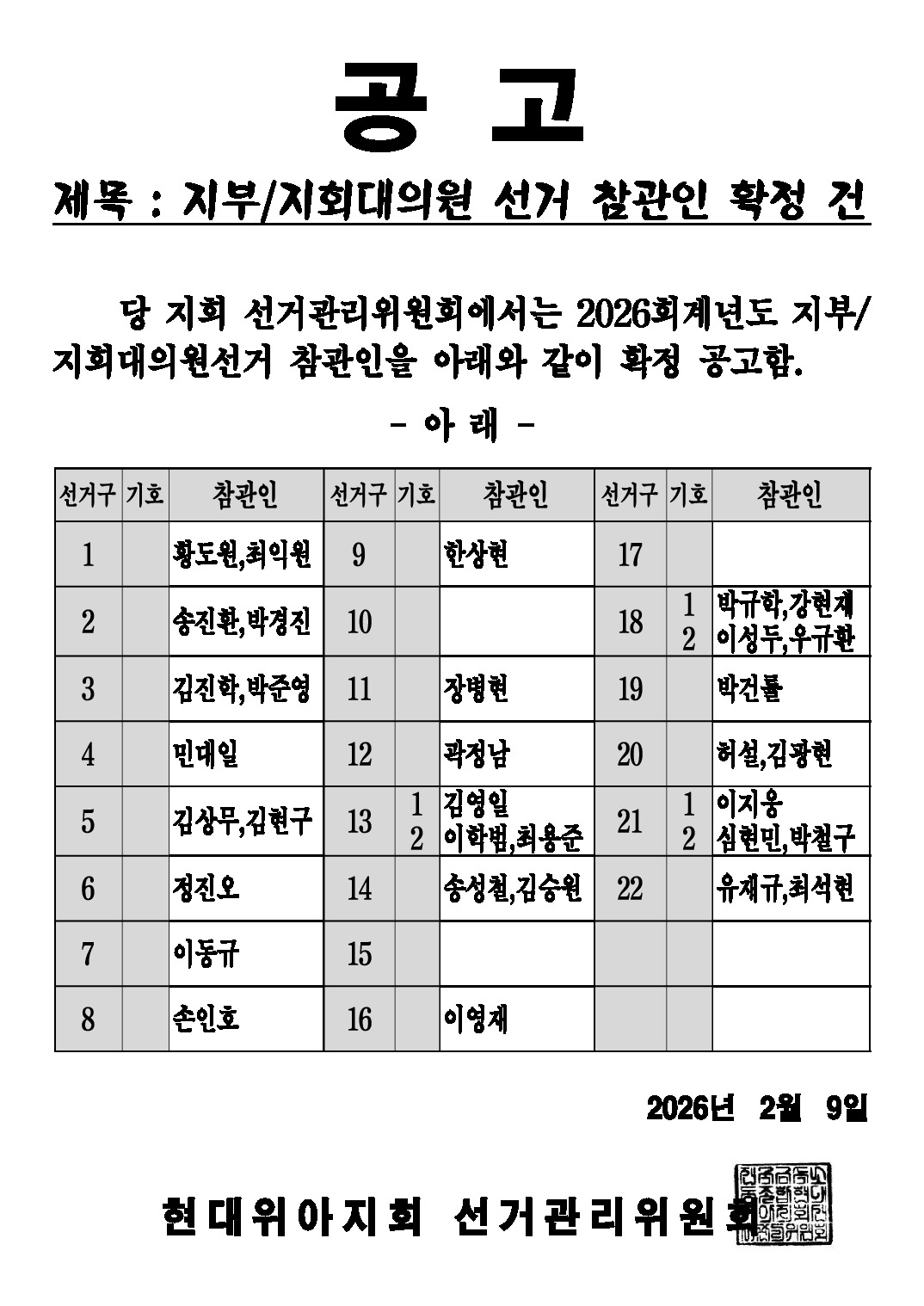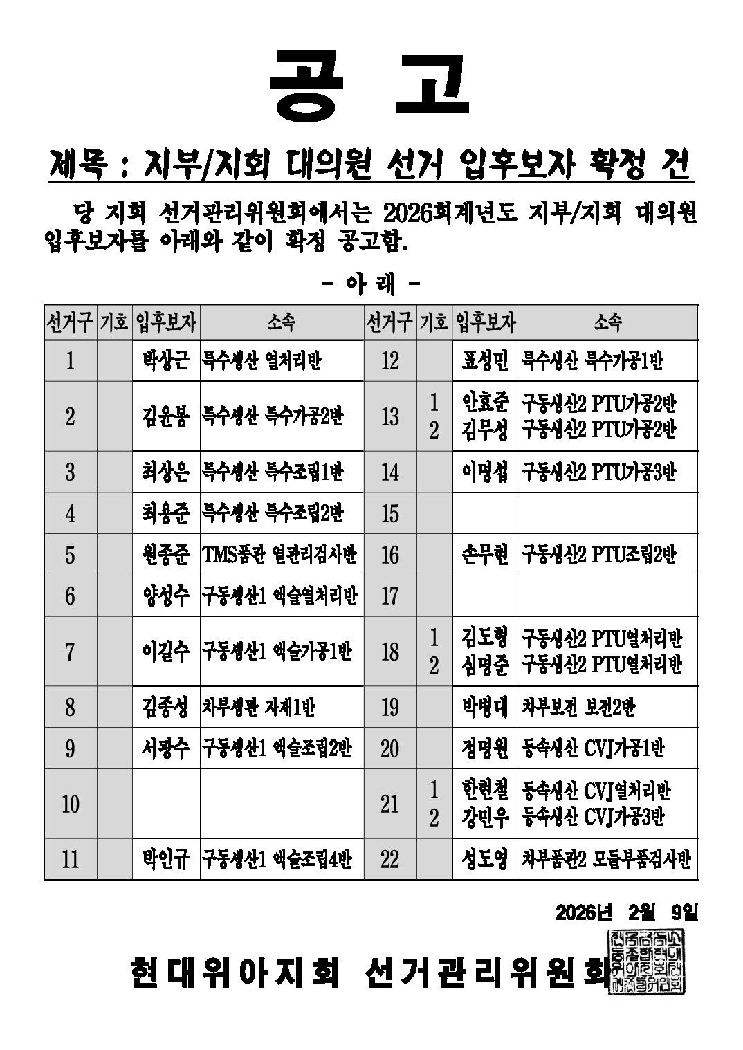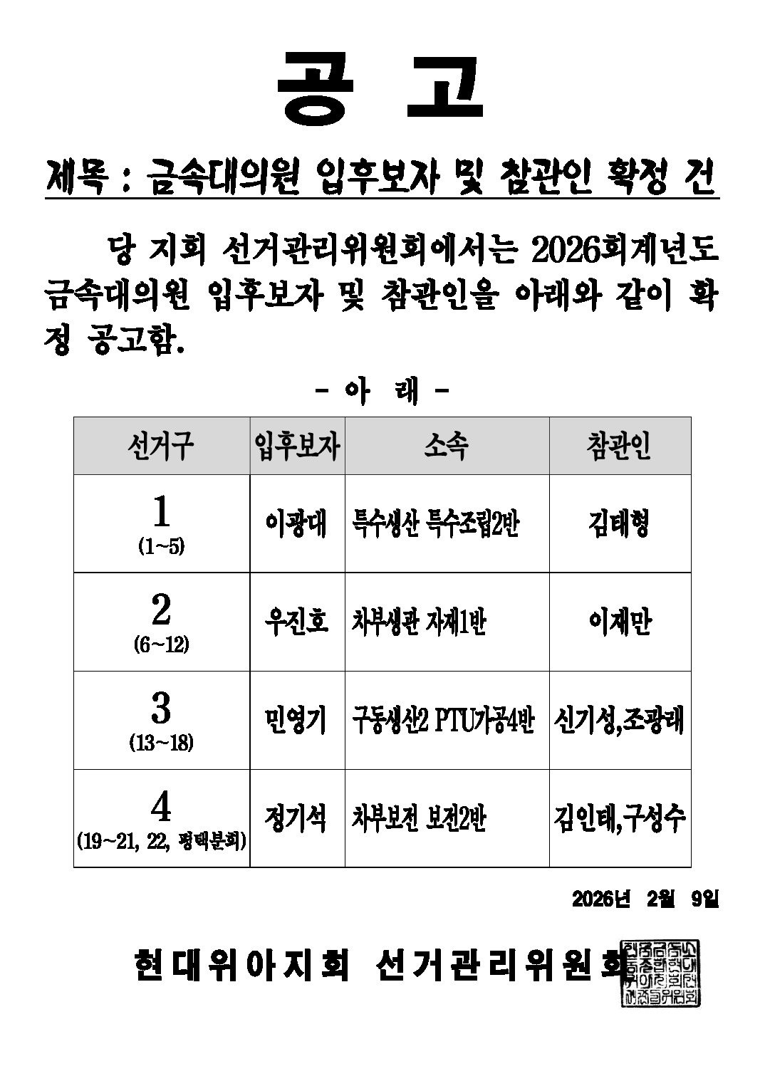 | 제목 | 선관위공고) 26'금속,지부,지회대의원 입후보 명단 외 | ||