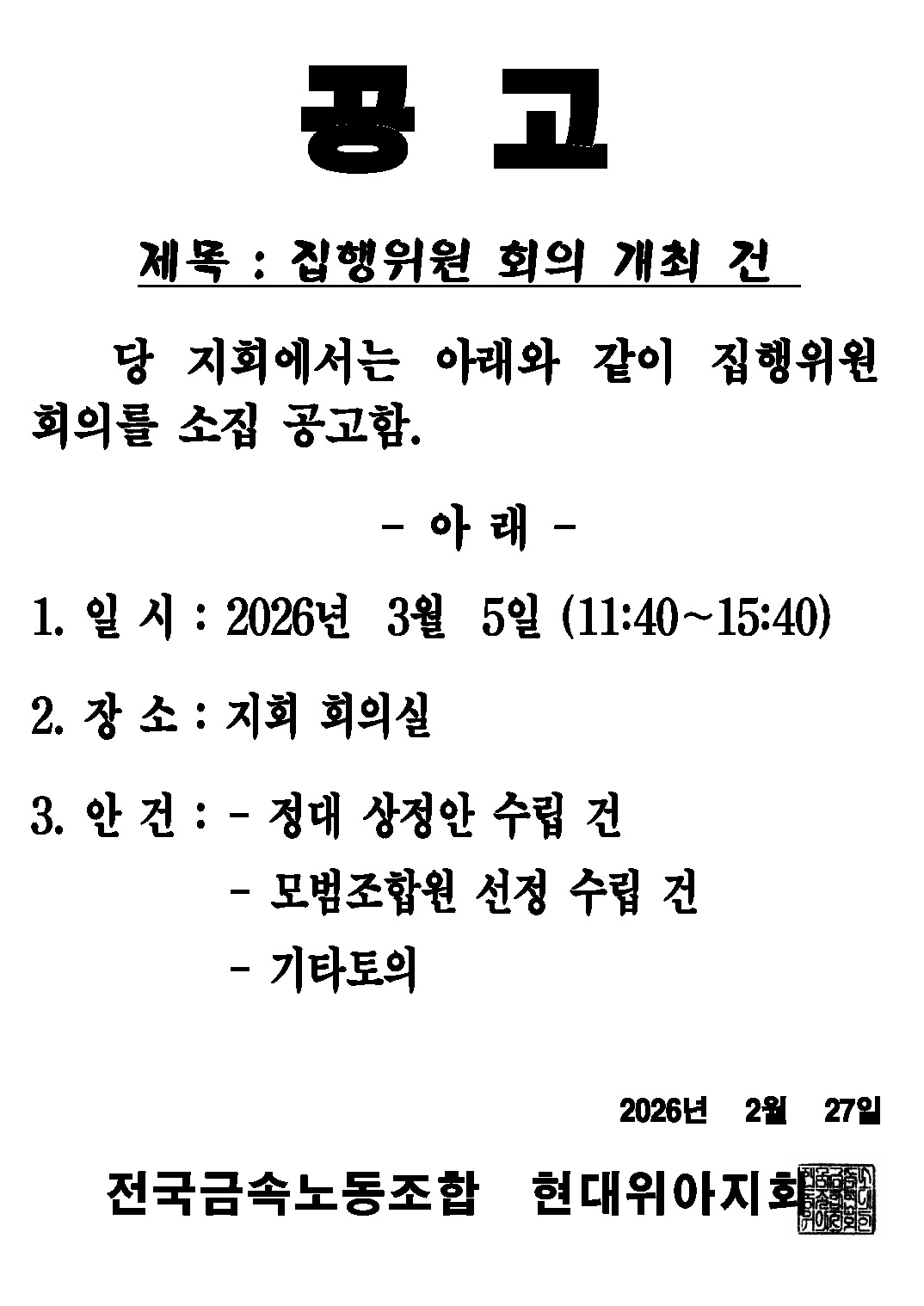 | 1059 | 공고) 조합원 임시총회 건 (26'금속.지부.지회.. | 2026-02-03 | 22 | |