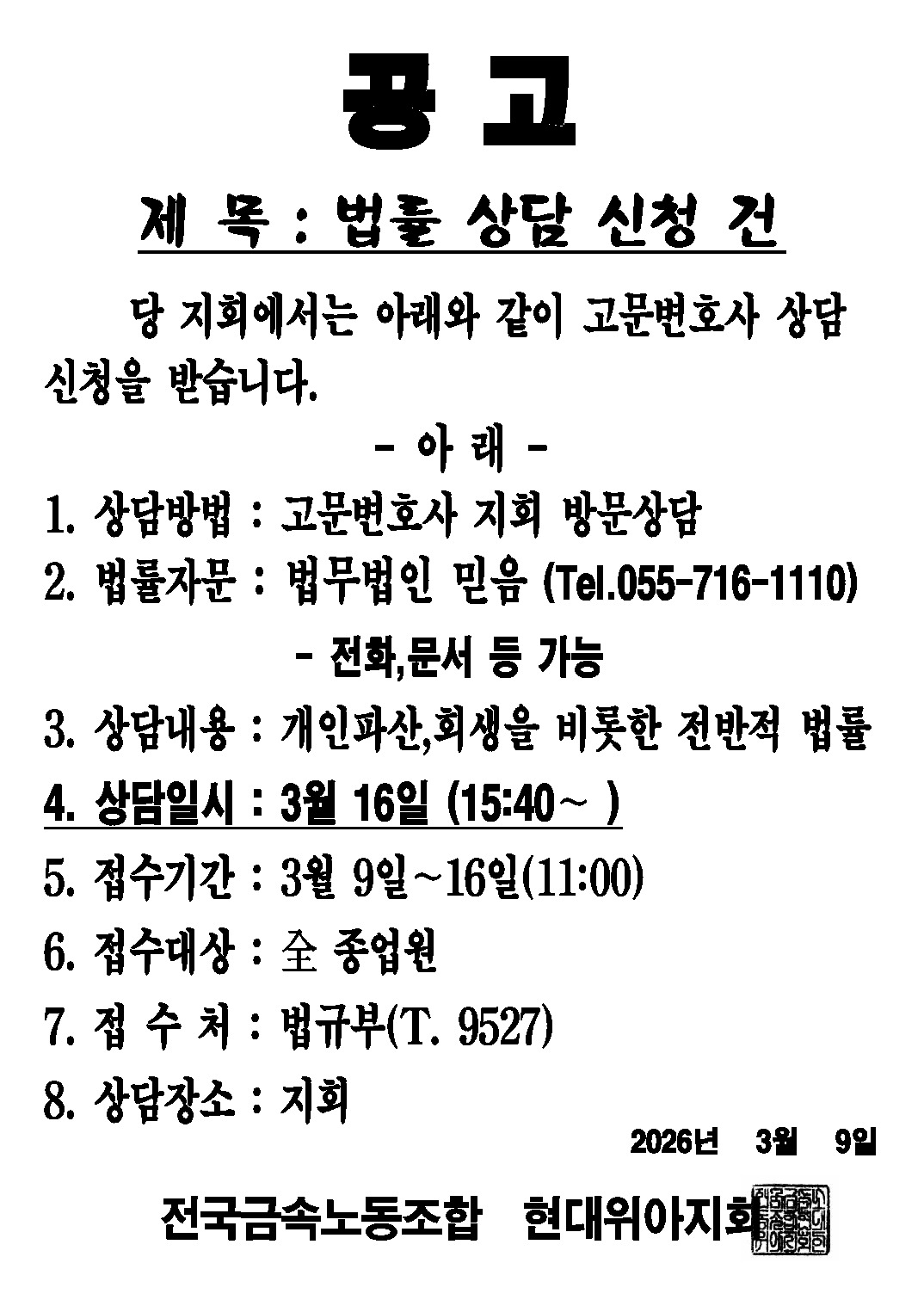 | 1059 | 공고) 조합원 임시총회 건 (26'금속.지부.지회.. | 2026-02-03 | 25 |
