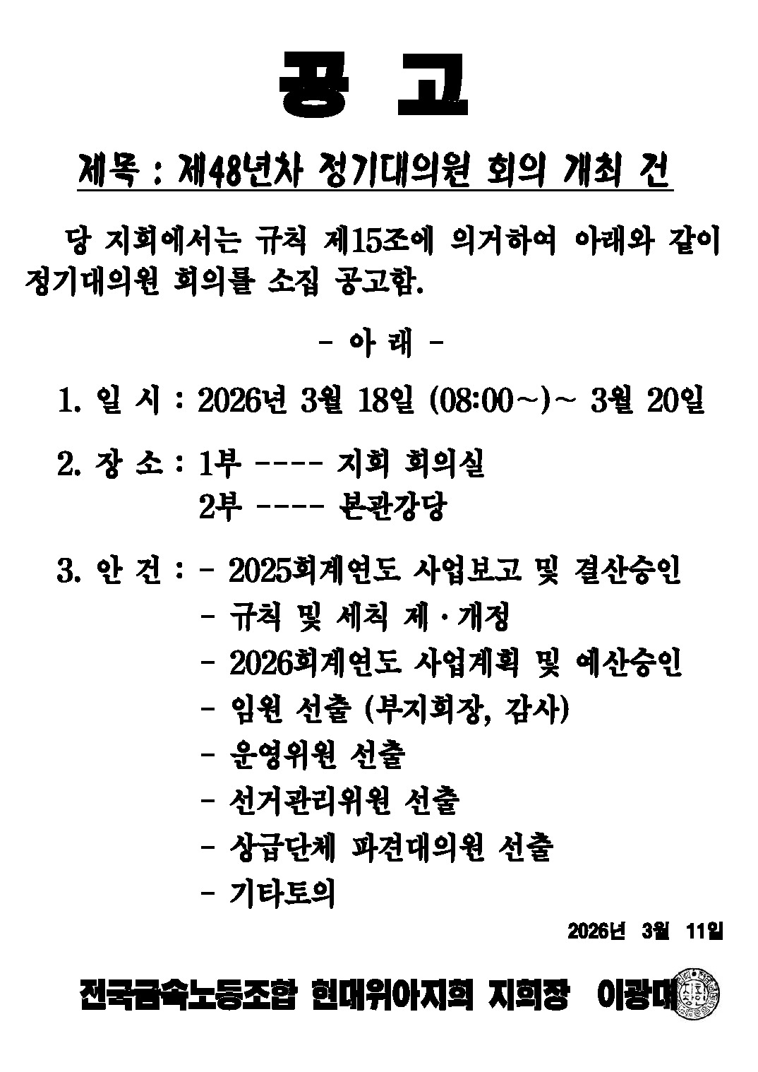 | 1064 | 선관위공고) 26'금속,지부,지회대의원 당선인 | 2026-02-13 | 44 | |