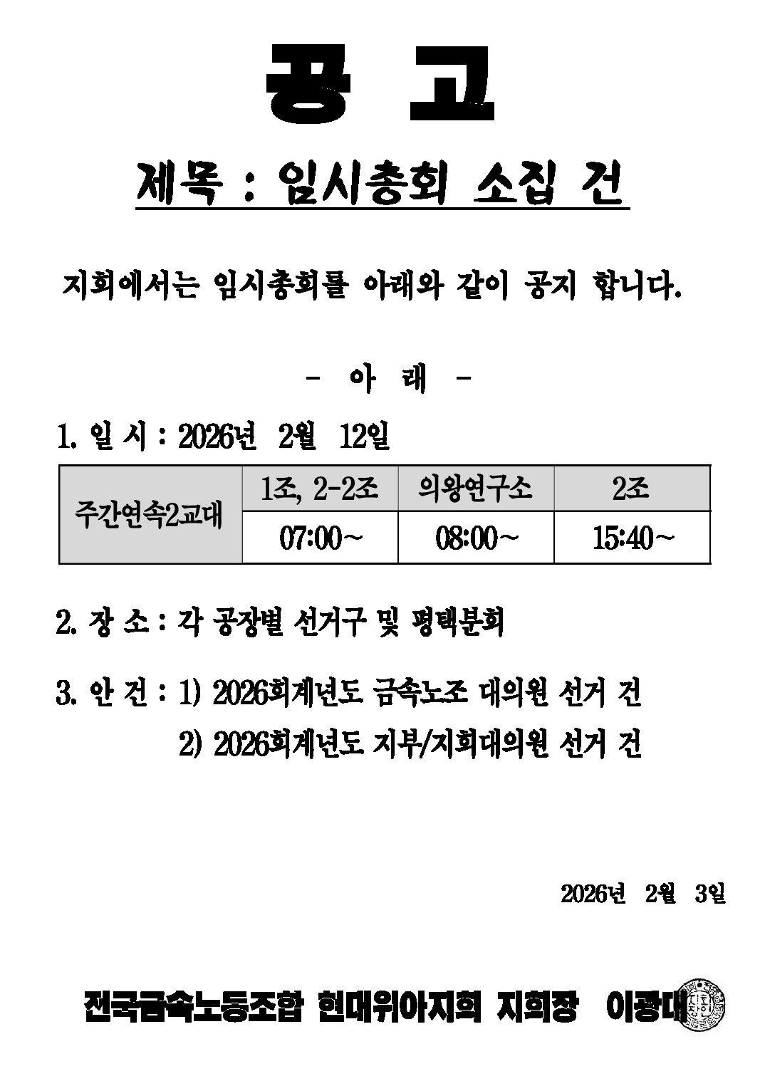 | 제목 | 공고) 조합원 임시총회 건 (26'금속.지부.지회 대의원 선거) | ||