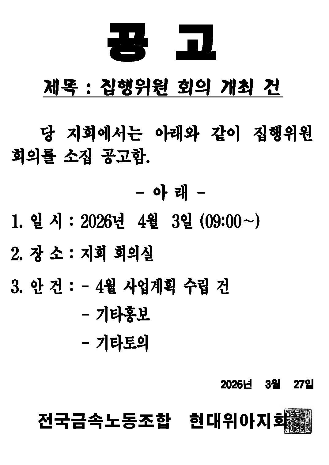 | 1069 | 공고) 48년차 정기대의원 회의 개최 건 | 2026-03-11 | 26 | |